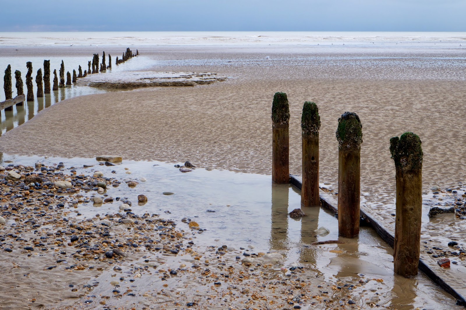 January 31st, walking on Winchelsea Beach in a luminous dome, across the empty zone between earth, sea and sky, at low tide, through icy wind and sleety rain with the sun behind the veil of cloud and a skin of water on the sand reflecting the sky.